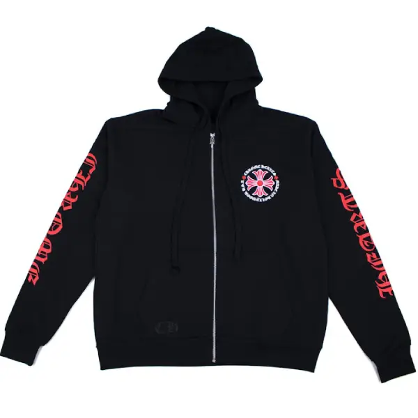 The Chrome Hearts Made in Hollywood Plus Cross Zip-Up Hoodie in Black/Red embodies the brand’s signature fusion of bold luxury, gothic influence, and superior craftsmanship. Designed and handcrafted in Los Angeles, this hoodie is a testament to Chrome Hearts’ “Made in Hollywood” ethos — representing the pinnacle of American-made streetwear with an unmistakable edge.