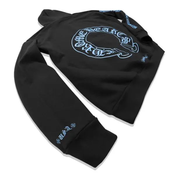 The design features the Chrome Hearts Horseshoe logo or gothic cross detailing (depending on the release version), printed in high-quality blue graphics across the back, with subtle branding on the chest and sleeves. The ribbed cuffs and hem, kangaroo pocket, and adjustable drawstring hood enhance comfort and practicality without compromising on style.
