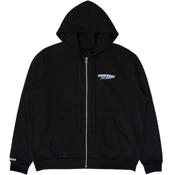 The full-zip design is complemented by custom Chrome Hearts silver-tone hardware, including the signature dagger zipper pull. It features an adjustable drawstring hood, split kangaroo pockets, and ribbed cuffs and hem for a structured, comfortable fit. Each hoodie is handcrafted in Los Angeles, ensuring precision detailing and authentic quality that define every Chrome Hearts garment.