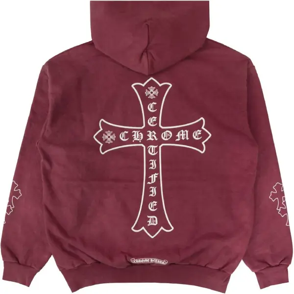 Constructed from premium heavyweight 100% cotton, this hoodie offers a soft, structured fit that combines comfort and craftsmanship. The washed red hand-dyed finish gives each piece a unique, one-of-one look, with subtle tonal variations that highlight its artisanal production. The front and back are adorned with Chrome Hearts cross motifs and Drake’s Certified Lover Boy-inspired branding, seamlessly blending both identities into one bold statement.