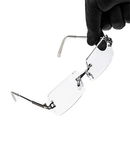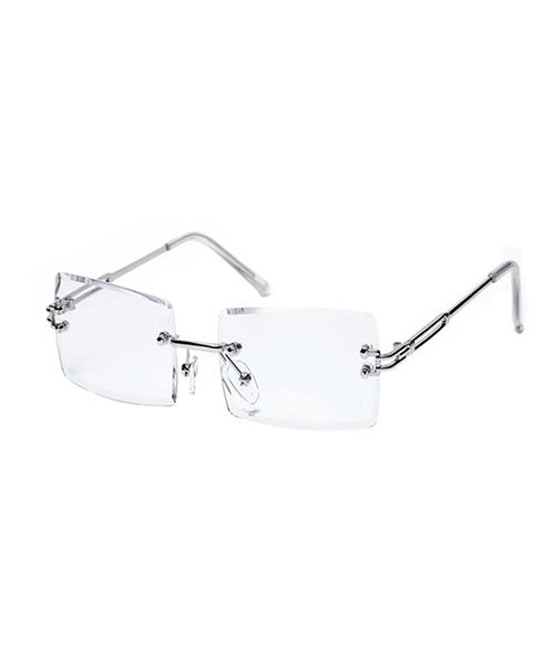 Rimless rectangular shape with signature silver detailing and clear lenses
